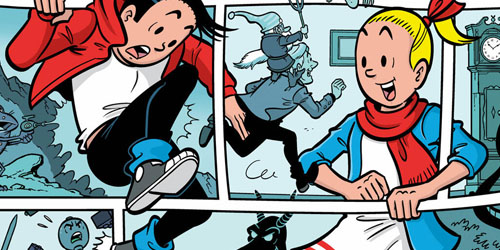Nadat de Teletransfor van professor Barabas gestolen wordt, flitst een mysterieuze motorrijder Suske en Wiske weg naar het album van een onbekende striptekenaar. Suske en Wiske moeten Kim Kicken, het hoofdpersonage van het bewuste stripalbum, helpen om een echte stripheld te worden. Slagen ze daar niet in, dan zullen ze voor altijd in het album gevangen zitten. Ondertussen trachten Lambik en Sidonia uit te zoeken waar Suske en Wiske zijn, door de dief van de Teletransfor te zoeken. De tijd dringt echter, want het stripverhaal bestaat uit allerlei knotsgekke maar zeker ook gevaarlijke situaties en Suske en Wiske hebben de grootste moeite om stripheld Kim Kicken in het gareel te houden...