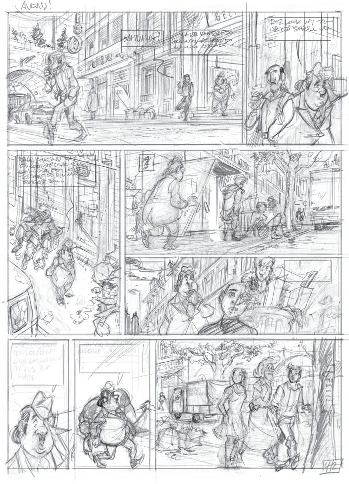 Hieronder zie je een schetspagina van de openingsscène van Gardavu!. Welke figuren herken jij?